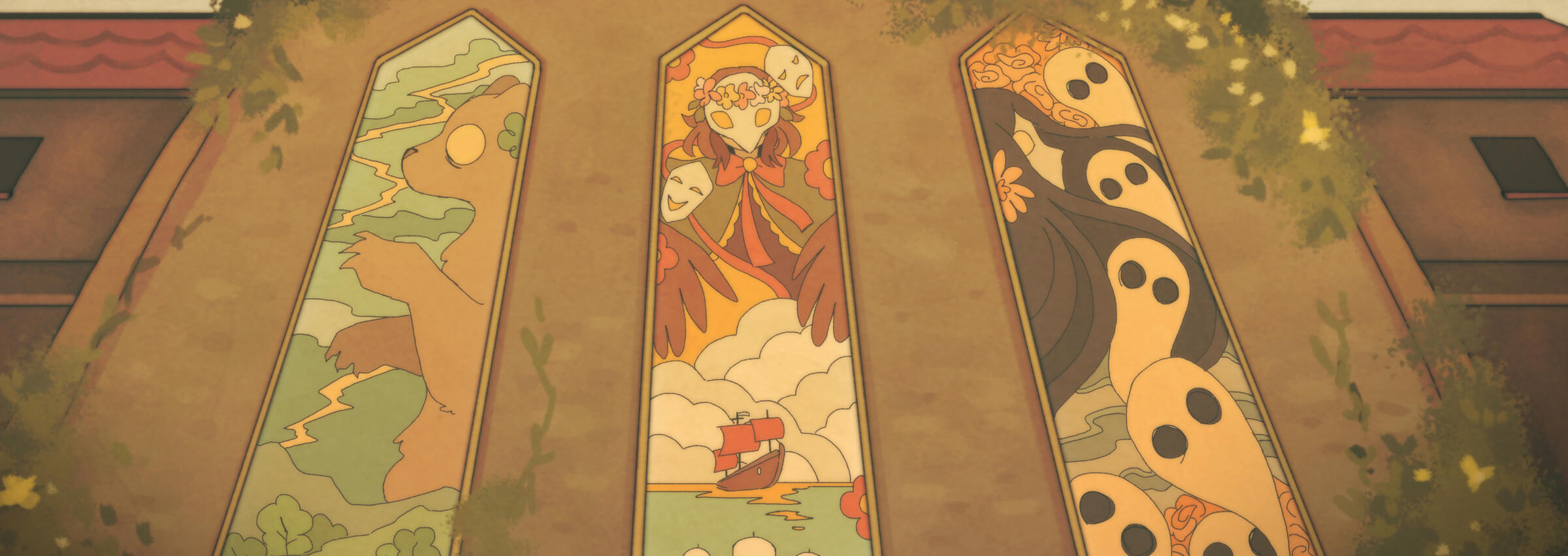 Bellflower Shrine - a place of worship for the old gods of Bells Harbor, mainly Feather the bardic god. There's three stained glass windows against an old overgrown church. The shrine outside is still being used.